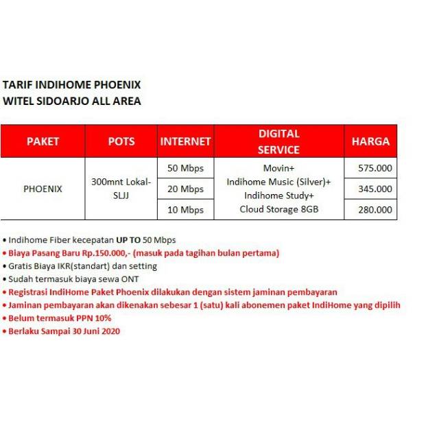 Jaminan pembayaran akan dikenakan sebesar 1 (satu) kali abonemen paket indihome yang dipilih. Indihome paket phoenix akan memberikan anda kemudahan dalam berinternet dengan kecepatan indihome 10mbps hingga 100mbps, serta anda akan mendapatkan bonus telepon 300 menit. Registrasi indihome paket phoenix dilakukan dengan sistem jaminan pembayaran. Layana paket indihome di antaranya adalah paket phoenix indihome , paket phoenix indihome adalah paket yang memberikan dual play internet dengan bonus telefon 300 menit paket phoenix. Paket indihome phoenix mencakup layanan internet 20 s/d 100 mbps & gratis telepon 300 menit & cloud storage 8gb | info pemasangan segera hubungi kami via wa.